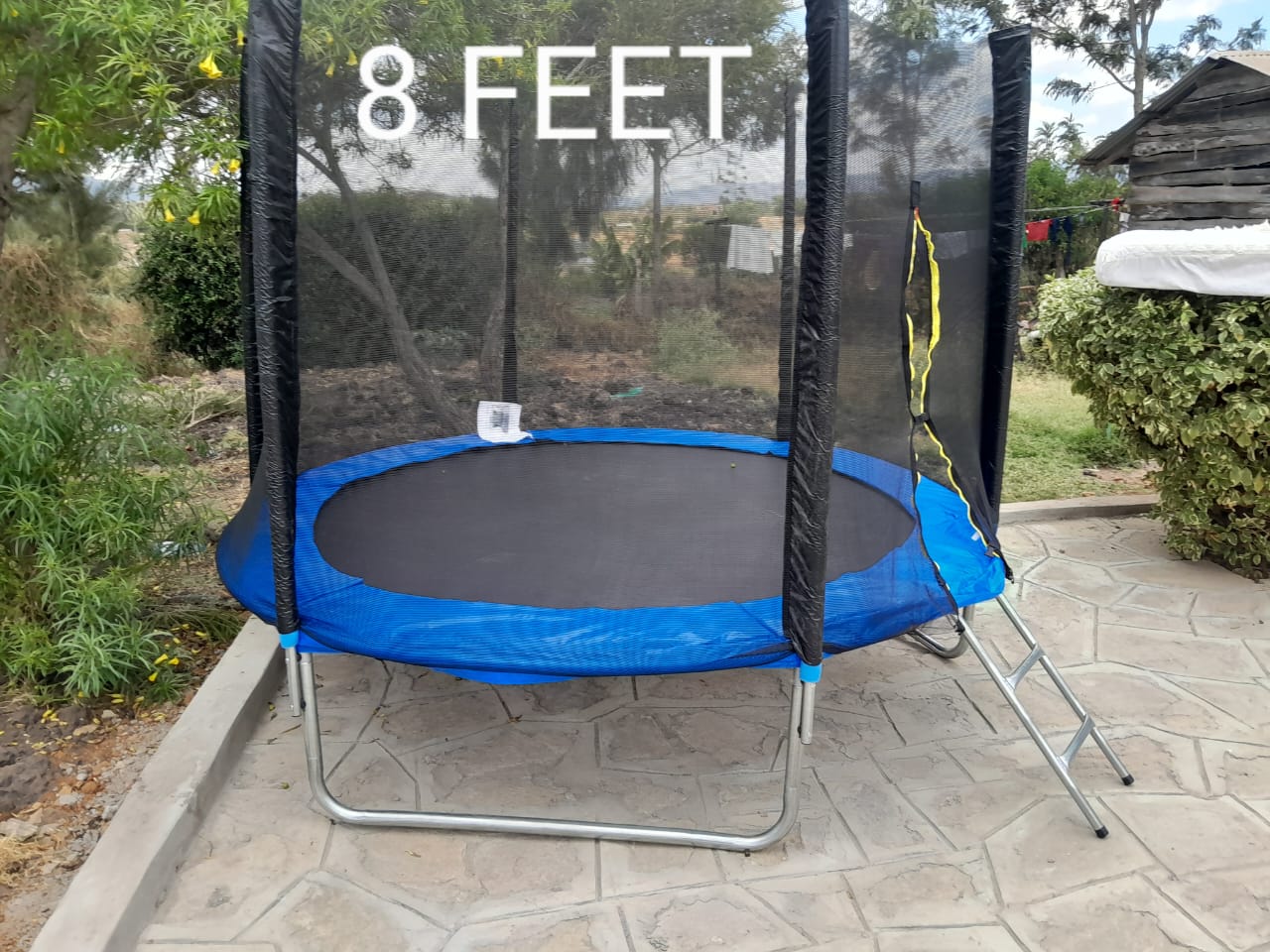 Shop our 8 Feet Trampoline with safety enclosure net. Strong steel frame, UV-resistant mat, and padded springs for safe backyard fun. Perfect for kids & teens.